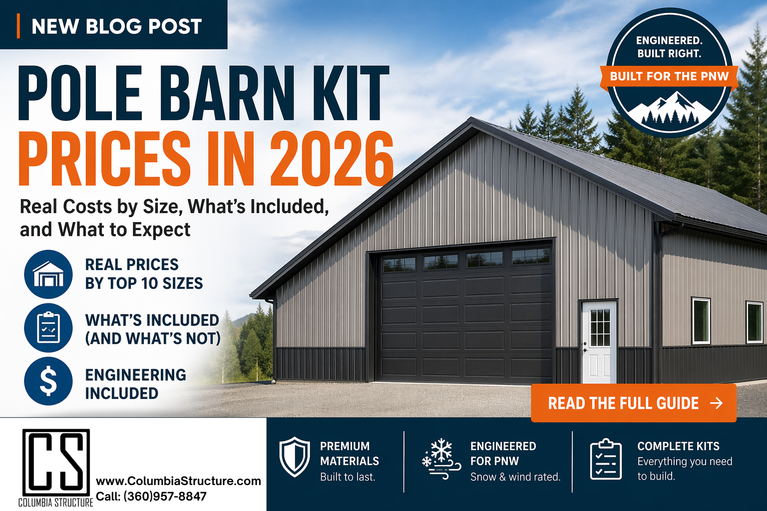 Meta Description: Complete pole barn kit prices for Washington State (2026). Engineered plans included. See real costs by size: 24×24 to 80×100. Get accurate quotes from Columbia Structure in SW Washington.