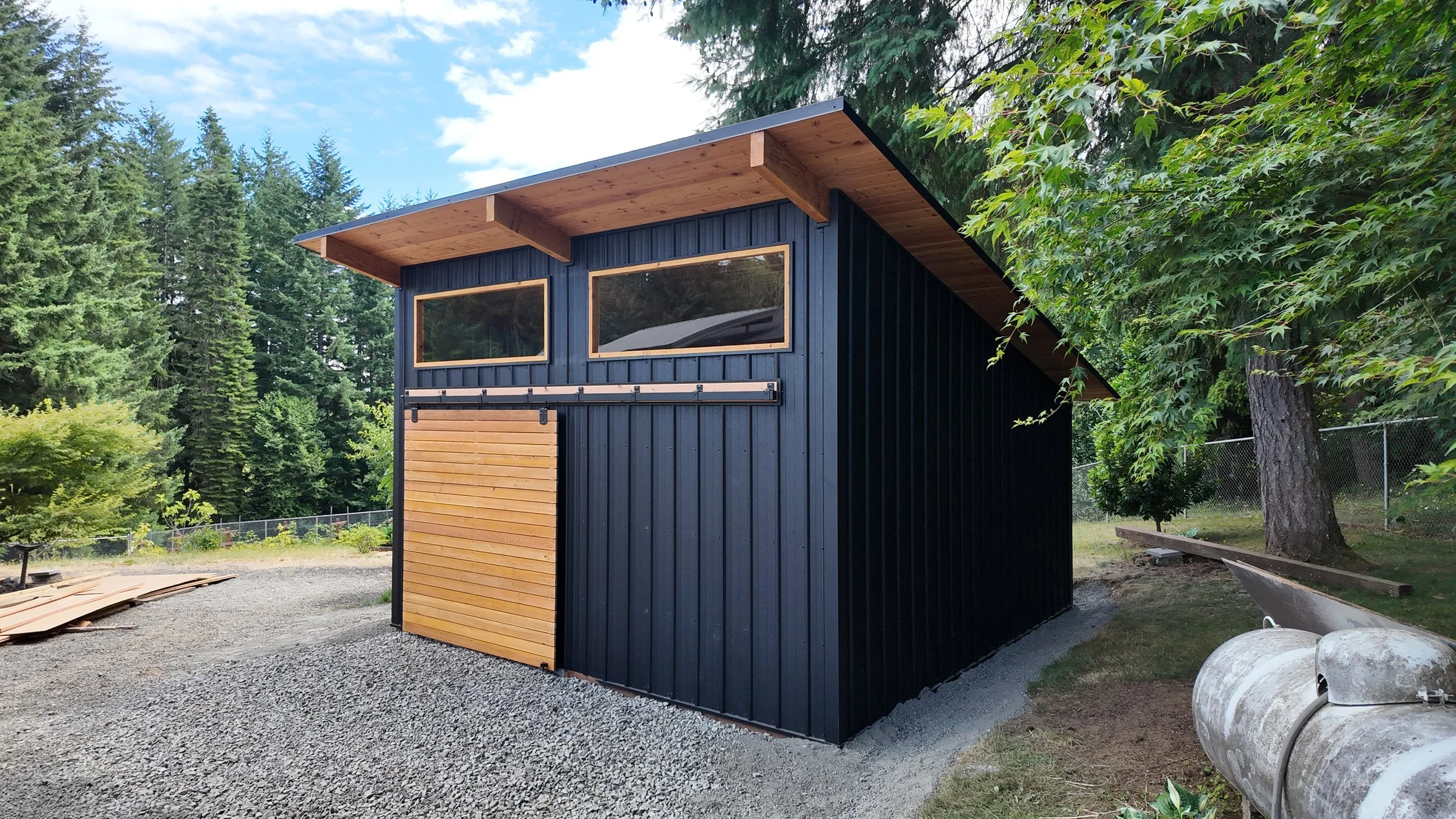 Daylight panels on the front and back bring in natural light, while a cedar-trimmed sliding door with a hidden blacked-out track adds a sleek, modern touch. The front elevation is completed with cedar-trimmed lighting and accents, all wrapped in durable metal siding and topped with a metal roof—built to withstand the Pacific Northwest weather.